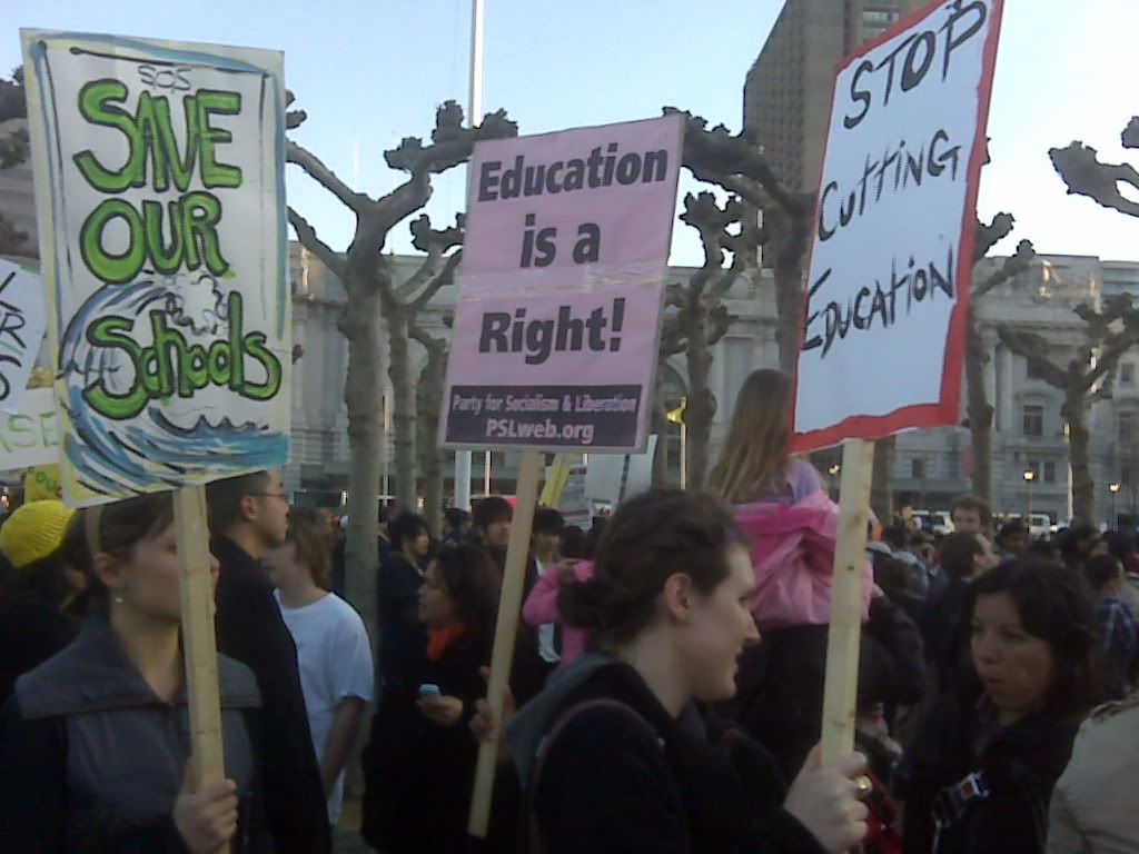 If you wanted a day of action then March 4, 2010 was a good example. Schools from all over California came to protest against the budget cuts. Everyone including the children were at the San Francisco Civic Center participating and trying to get their message out. At first there we're only a hand full of people there, but as soon as the schools started to arrive the civic center was packed from left to right. It wan not just at the civic center where people protest, later on that night people took to the streets and walked down market street to let everyone know what was going on. The fact that we do not need any more budget cuts and that we do feel the effects of what they are doing to us. Things such as classes being cut, teachers being laid off, and classrooms either shrinking or enlarging to the point where students can not even take a seat. Even in our hip hop class you can see how it affects us because not everyone gets to sit in a chair during class. Hopefully our voices were heard and let people know of whats happening to our school systems because it should not be over looked anymore.